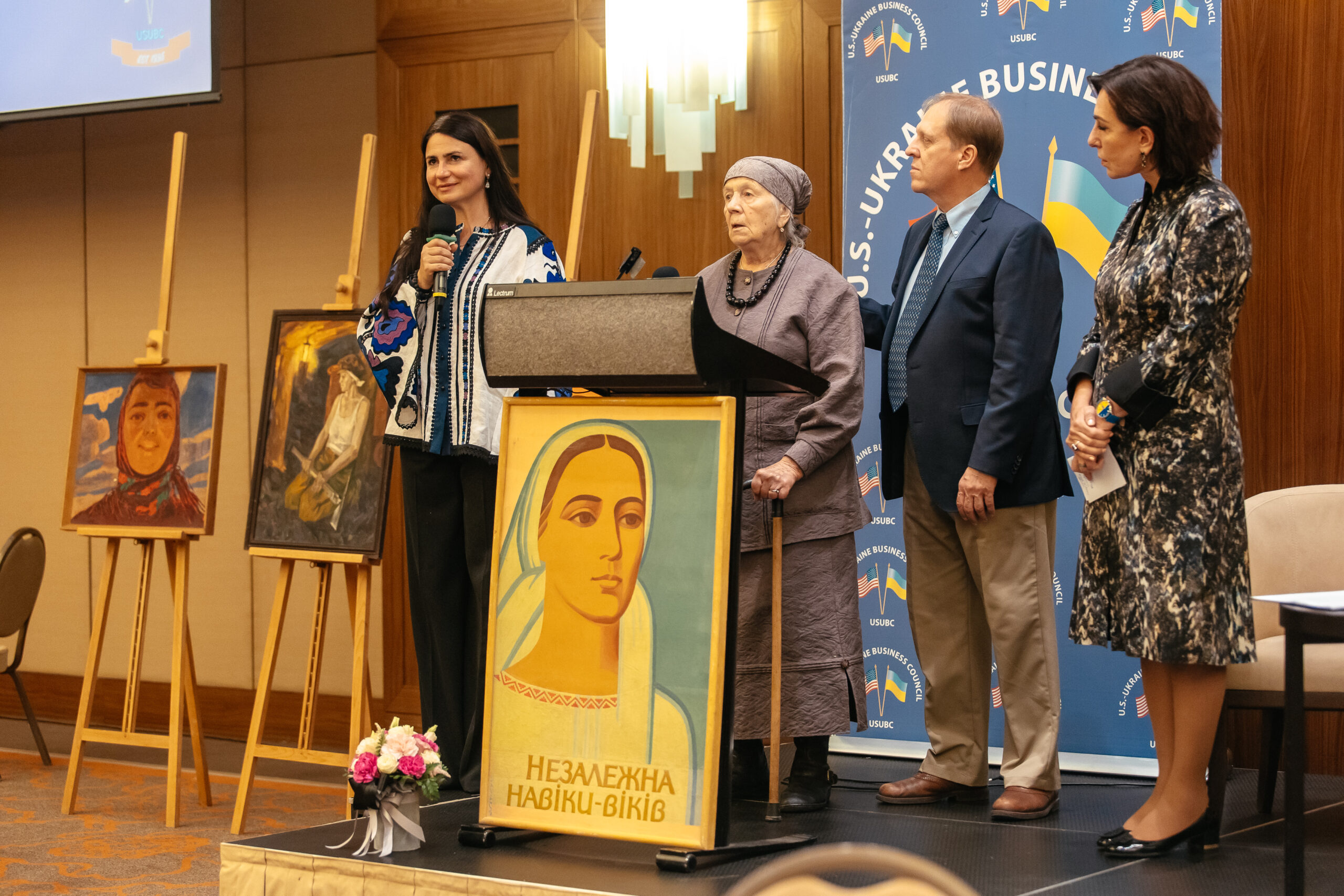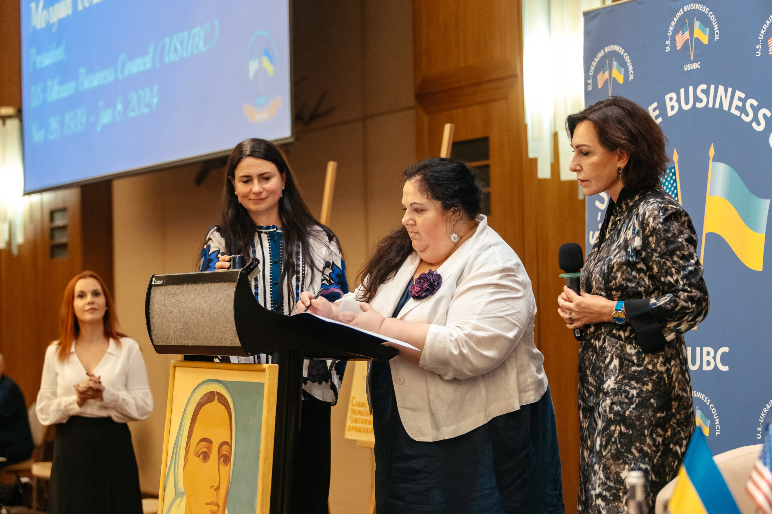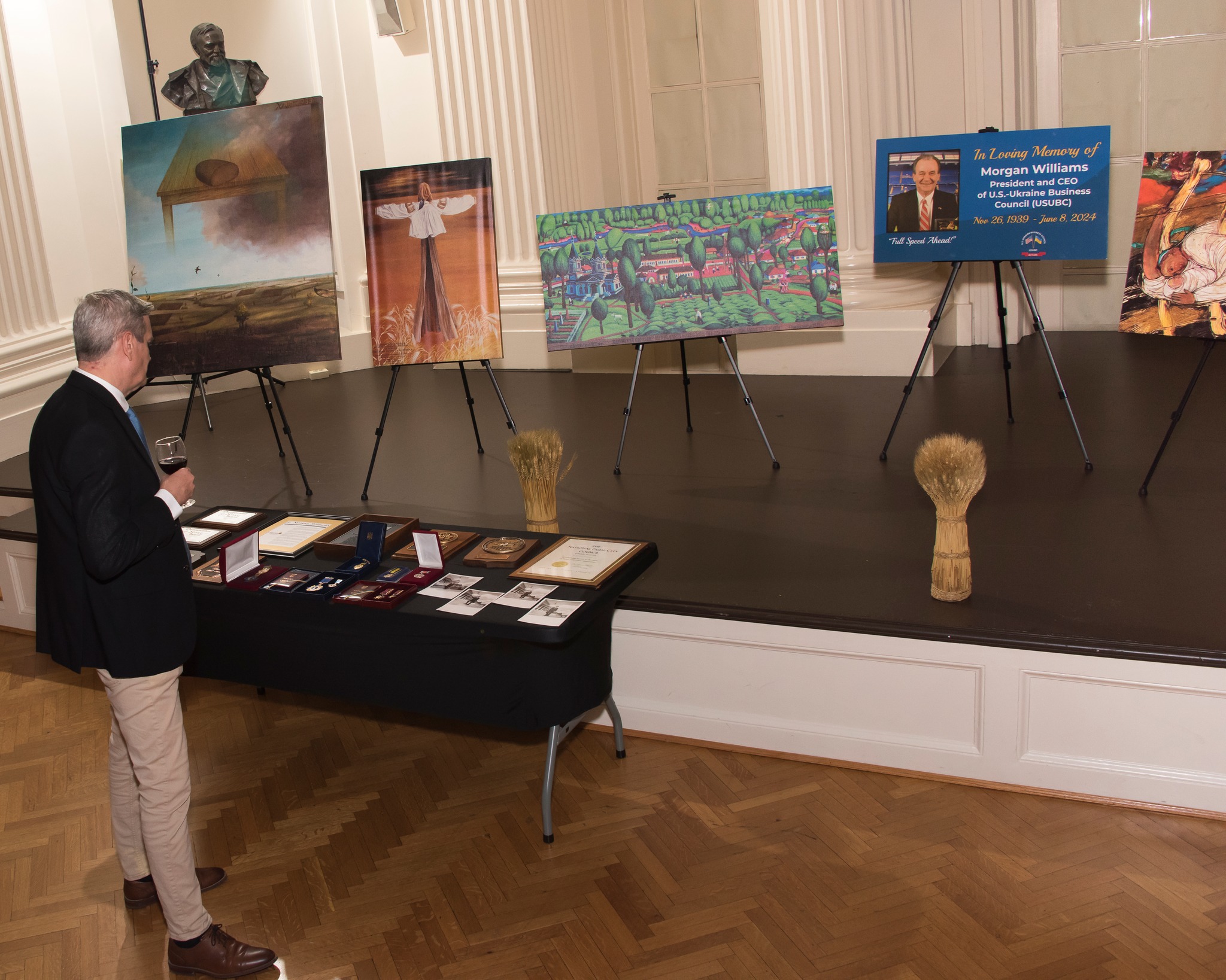The highlight of the evening was the ceremony of signing of the Gift Agreement with the National Museum of the Holodomor-Genocide, donating Morgan’s invaluable collection of artworks and books on the Holodomor to the Museum. Lesia Hasydzhak, General Director of the Holodomor Museum, expressed her profound gratitude for this generous gift to the Ukrainian Nation by Edward Morgan Williams, his Family and the U.S.-Ukraine Business Council (USUBC).
