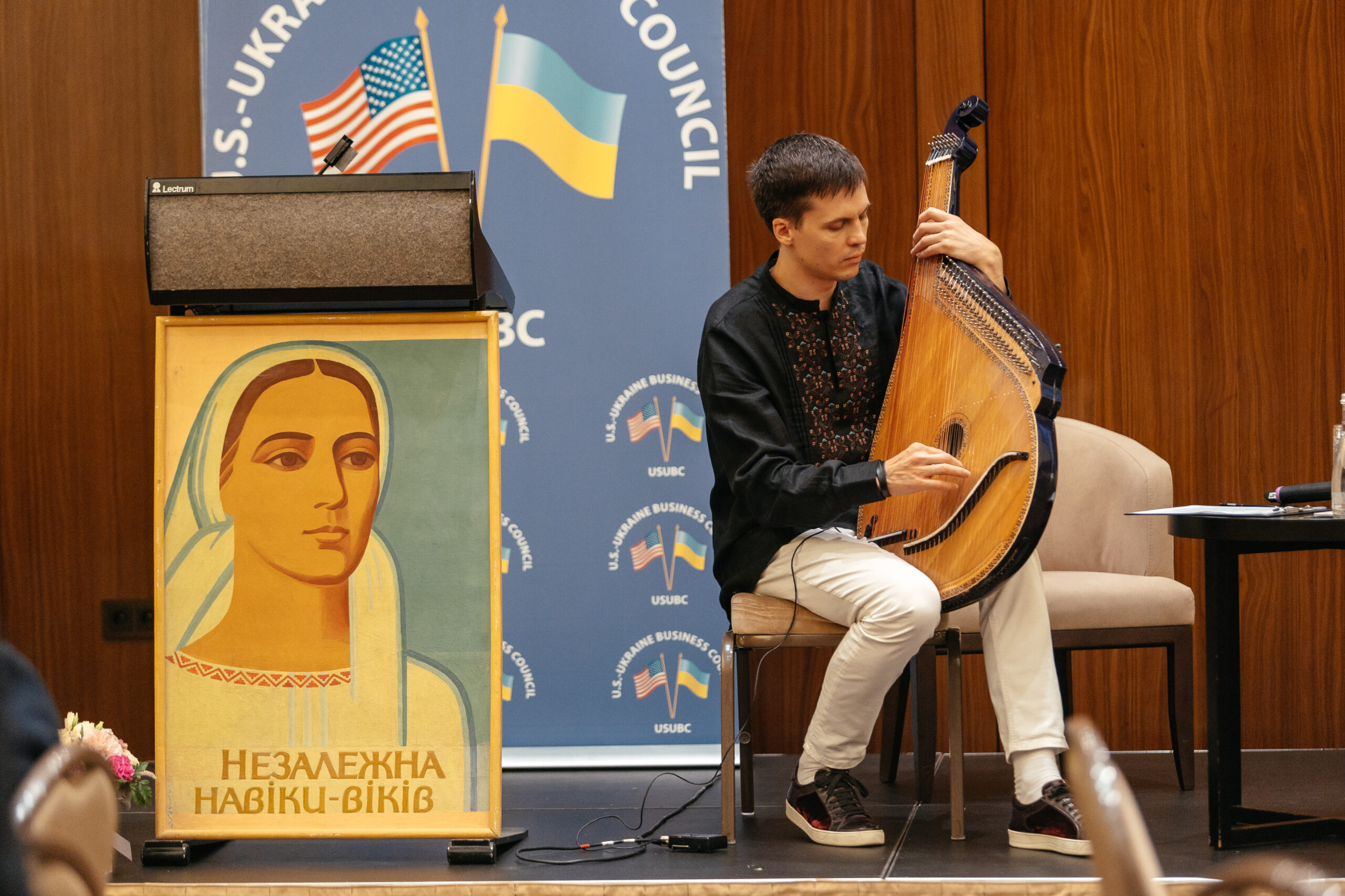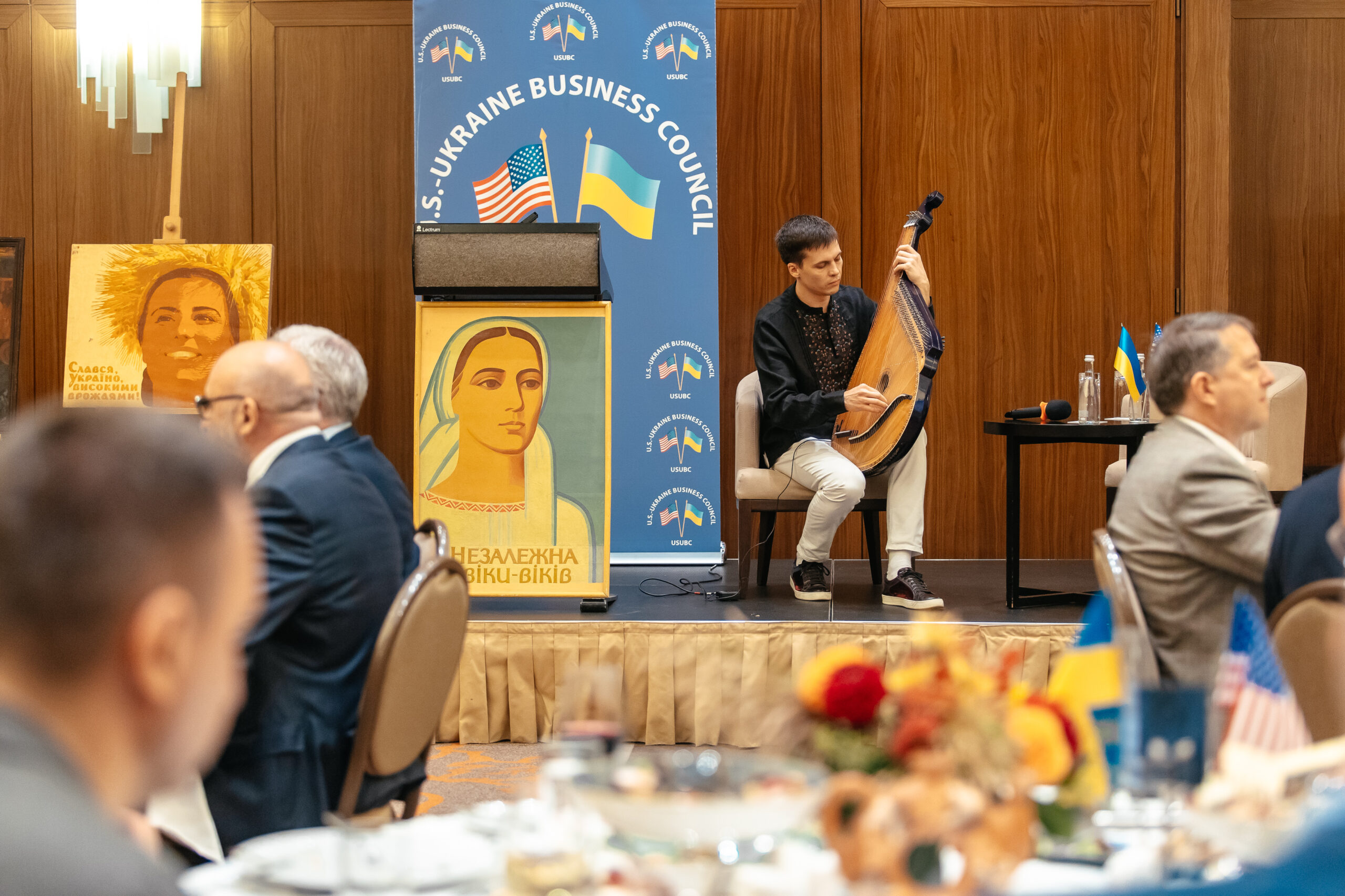 Throughout the event, attendees enjoyed live performances by Gerdan, a Ukrainian-American musical ensemble, and a beautiful bandura duet “Malvy” by Uliana and Kalyna Leshchuk. Cherished memories of Morgan were shared by USUBC colleagues Irina Paliashvili, Nadiia Khomaziuk, Alex Slusarenko, Greg Fishman JD, and tributes from USUBC members were rendered by Tom Bryan from Great Plains Manufacturing, Tanya Shea of the People of Ukraine Foundation, Matthew Murray from Velta —all of whom had closely worked with Morgan. The program, moderated by Eric Luhmann, Chair of USUBC’s Executive Committee, concluded with moving renditions of “My Way” and “Amazing Grace,” the songs honoring Morgan’s unique spirit.